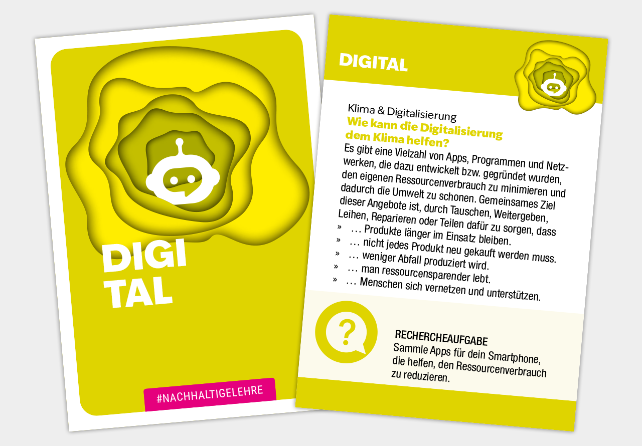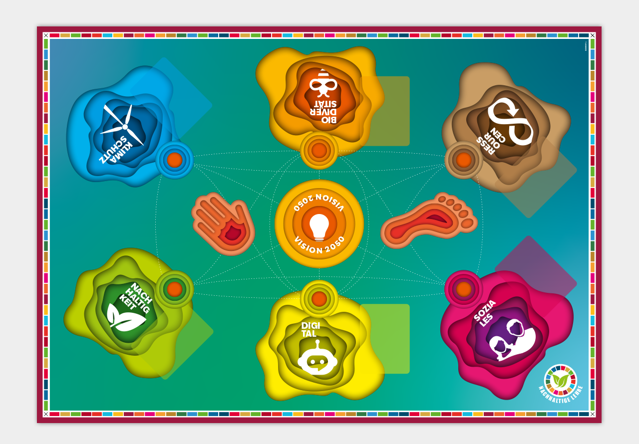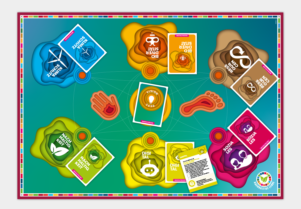Nachhaltigkeit wird bewusst nicht grau oder moralisch inszeniert, sondern als vielfältiges, lebendiges Thema. Das Design transportiert Offenheit, Neugier und Vielfalt und unterstützt damit den spielerischen Zugang zu ökologischen, sozialen und wirtschaftlichen Fragestellungen.